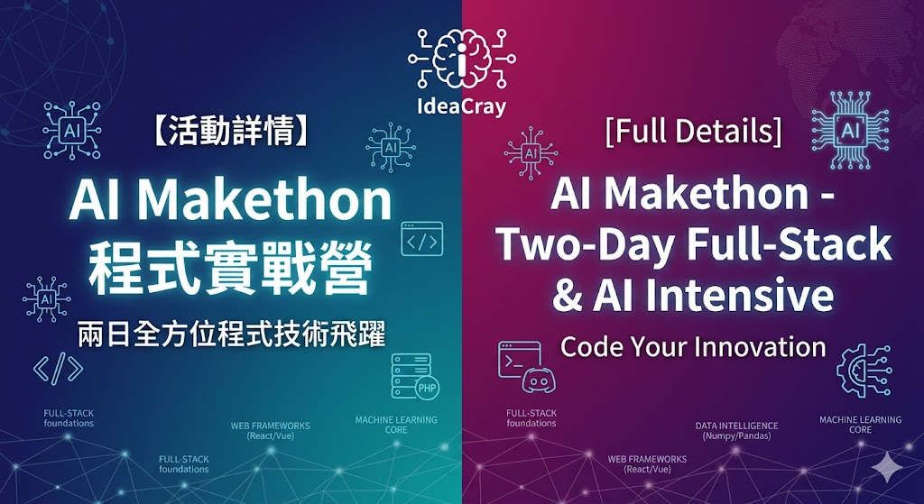 想要將您的創意轉化為現實,卻苦於技術門檻?IdeaCray 誠邀您參加為期兩天的 AI Makethon。這不僅是一場馬拉松式的編程挑戰,更是一次從網頁開發到人工智慧應用的技術飛躍。我們將帶領您跨越 PHP、JavaScript、Python 以及機器學習的核心領域,為您的技術轉型打下堅實基礎。