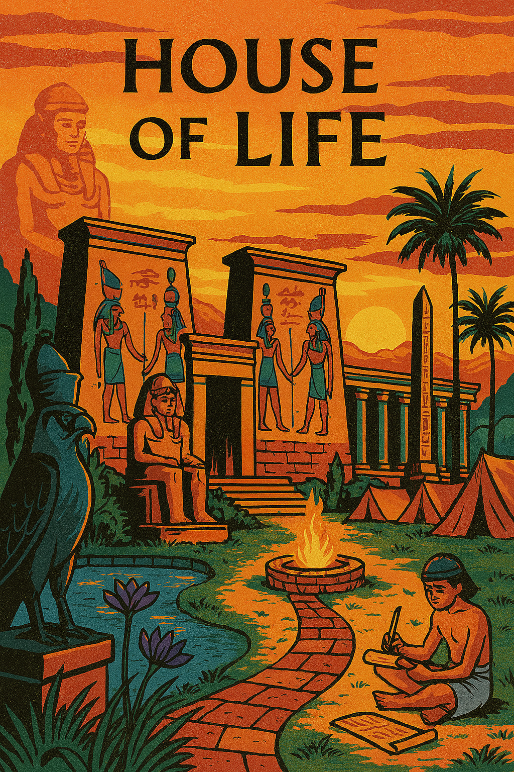 太陽神之舟越過地平線,朝聖者匯聚蘆葦邊營地,陰影下矗立方尖碑與蓮花池。新ka甦醒雕塑其ba:奧西里斯牧杖的祭司?寇爾眼眸的伊西斯魔法女祭司?還是鷹頭荷魯斯復仇者?神殿書記引導儀式,在乳香捲曲與尼羅微風中於莎草紙銘刻命運。以輕盈訓練步入奧秘——瑪特之羽輕權衡心臟、boffer杖槍模擬塞特風暴的對練,以及聖甲蟲獵取隱藏護符。笑語如河水蕩漾,機制揭曉:骰子求神恩、道具釀靈藥。暮色輝映時,紗幕稀薄;你不再是凡人,而是永恆的迴響。