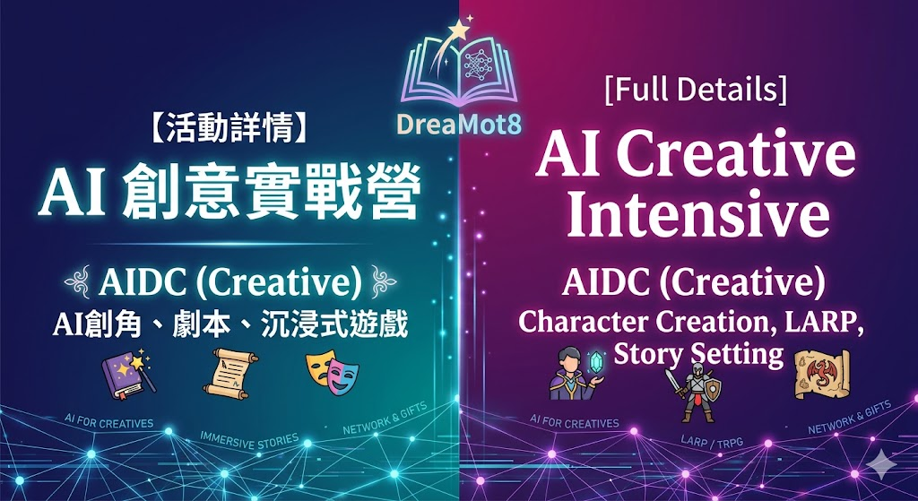 當先進的人工智慧遇上深度的敘事靈魂,會碰撞出什麼火花?DreaMot8 誠邀所有對創作、編劇及沉浸式遊戲充滿熱情的追夢者,參加這場專為「創意人」打造的全日實戰營。我們將帶領您利用 AI 技術,從零開始構建專屬的角色與世界觀,並將其轉化為真實可玩的遊戲腳本。